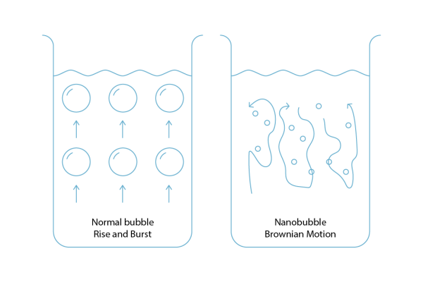 Nanobubbles are neutrally buoyant and can remain suspended in liquid for months and due to the Brownian Motion will travel randomly throughout the body of water. This unique behavior enables nanobubbles to provide a homogeneous distribution of gas throughout the water column and efficiently aerate the entire body of water.